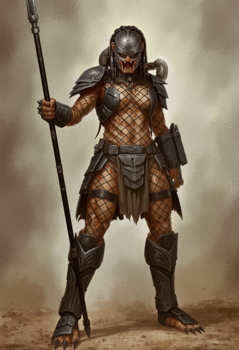 intricate impressionist painting upper body portrait of a skinny but athletic (23 year old female woman) yautja alien, yelling with mouth open showing fangs, wearing heavy yautja armor, full body fishnet body suit, in one hand he is holding a high tech spear that is stuck in the ground next to him