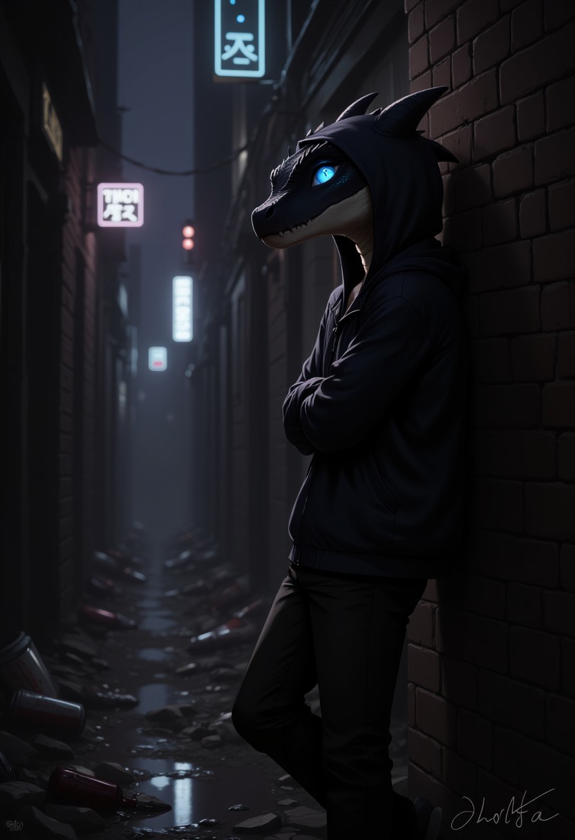 A male anthro dragon leans casually against a brick wall in a dark, shadowy alleyway, arms crossed over his chest. His hooded jacket casts deep shadows over his face, but his eyes glow a vivid, electric blue, standing out starkly against the dimly lit background. The alley floor is scattered with trash, broken bottles, and small puddles reflecting faint, flickering light from distant neon signs. The muted tones of the alley’s damp concrete and grimy texture make the dragon’s bright eyes the focal point of the image, pulling the viewer in as they pierce through the surrounding darkness.