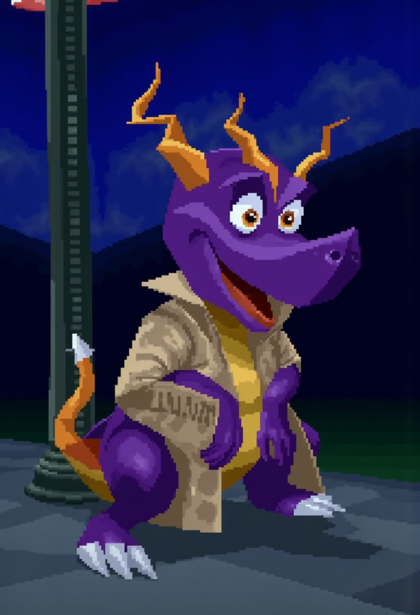 starfoxstyle, low poly, Spyro the Dragon leaning against a street sign wearing a trenchcoat at night. Abstract polygon nighttime street background. <lora:Star_Fox_SNES_Style_F1D-000023:1.0>