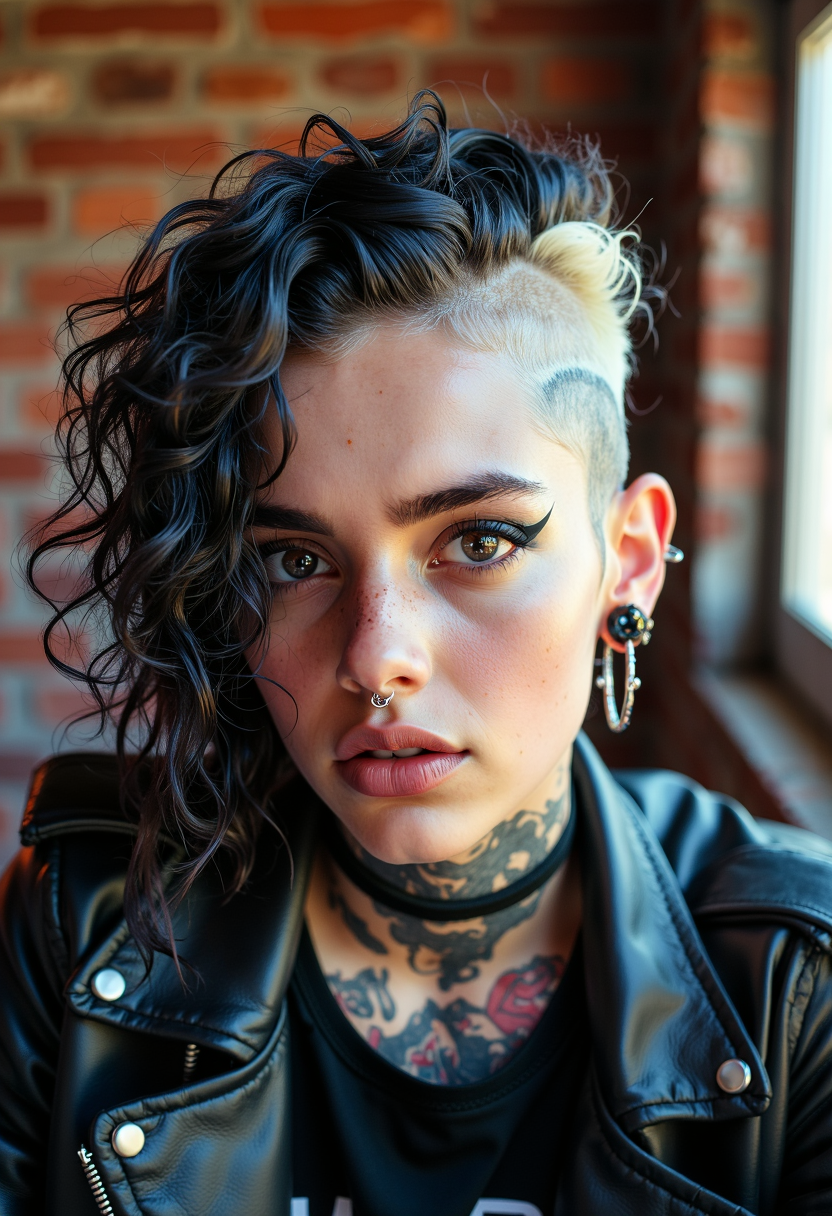 A webcam-style portrait of a 28-year-old woman with an alternative, edgy appearance. She has a half-shaved head, with long black hair on one side and a bleached blonde buzzcut on the other. Her visible ear is adorned with multiple piercings, including an industrial bar and several hoops. She has bold, dark eyebrows and wears dramatic winged eyeliner. A small septum ring glints in her nose. The woman is sitting in front of a brick wall, likely in an urban loft or studio apartment. She's wearing a black leather jacket over a band t-shirt, only partially visible in the frame. Her expression is confident and slightly defiant, with one eyebrow slightly raised. Natural light from an off-camera window creates interesting shadows, accentuating her facial features and the texture of her varied hairstyle. The webcam captures her from the shoulders up, showing the contrast between her edgy style and the raw, industrial background. Despite the typical limitations of webcam technology, the image quality is good enough to show details like her intricate tattoos peeking out from her collar and the different textures of her hair. The lighting gives her skin a warm glow, contrasting with her dark attire and hair.