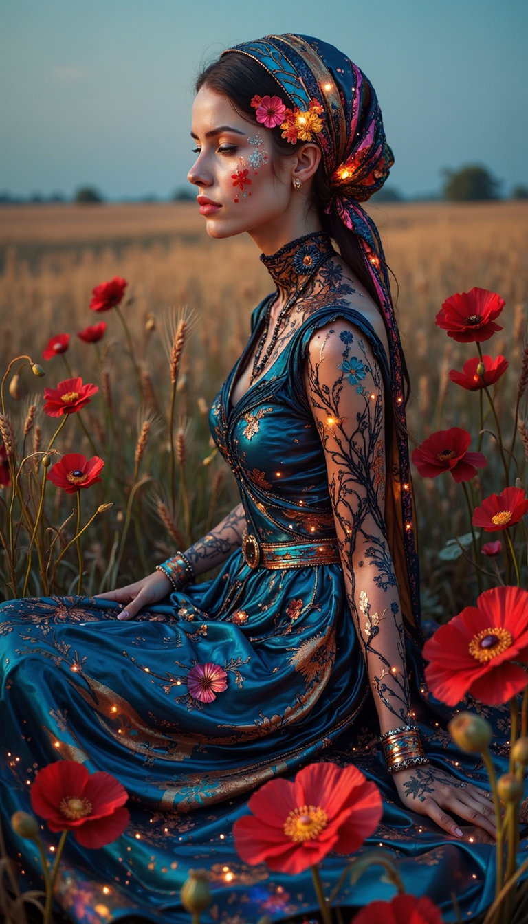 Bioluminescent,evangsurreal,surrealism,glitter, A young woman, adorned in a resplendent vermillion headscarf and a somber, sapphire blue dress embellished with intricate black lace, sits pensively amidst a fulvous meadow, her form silhouetted against a cerulean sky. Capture her in a medium shot, emphasizing the melancholic solitude emanating from her pose - a three-quarter view with her gaze drifting towards the horizon. The waning sunlight bathes the scene in a warm, nostalgic glow, highlighting the delicate details of her attire and the textural contrast between her smooth skin and the rough fabric. The background should be a hazy expanse of golden wheat fields, interspersed with vibrant crimson poppies, their color echoing the vibrancy of her headscarf. Maintain a hyperrealistic style, reminiscent of pre-Raphaelite art, with meticulous attention to detail and a muted color palette.