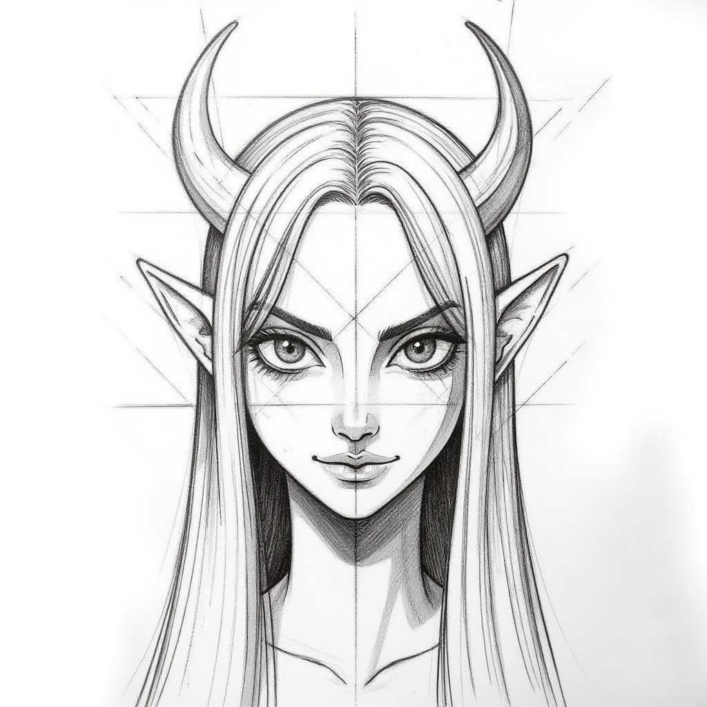 industrial_design_sketch_style,construction lines,Close-up of a female demon, centered and symmetry, sinister appearance,long straight hair,curved horns.