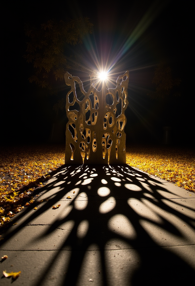 The photograph features stunning shadows created by a single spotlight shining down on an abstract sculpture, reminiscent of Outsider Art. The artwork consists of various shapes and textures, casting intricate shadows on the ground below. The golden hues of autumn leaves can be seen in the background, adding to the Halloween-like atmosphere. The image is taken from a medium shot with a slight low angle, showcasing the entire sculpture and its surroundings. The dramatic lighting and short exposure create an otherworldly effect, making the artwork appear both beautiful and eerie. Overall, this photograph is a striking example of Lifestyle Photography, capturing the essence of creativity and uniqueness found in outdoor installations. ,<lora:flux_realism_lora.safetensors:1.0>