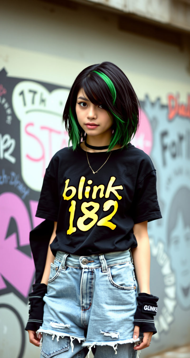 a 2000s emo girl, emo combed back classic girl emo hair, black and green. She is wearing a "Blink 182" t shirt along with skater baggy jeans