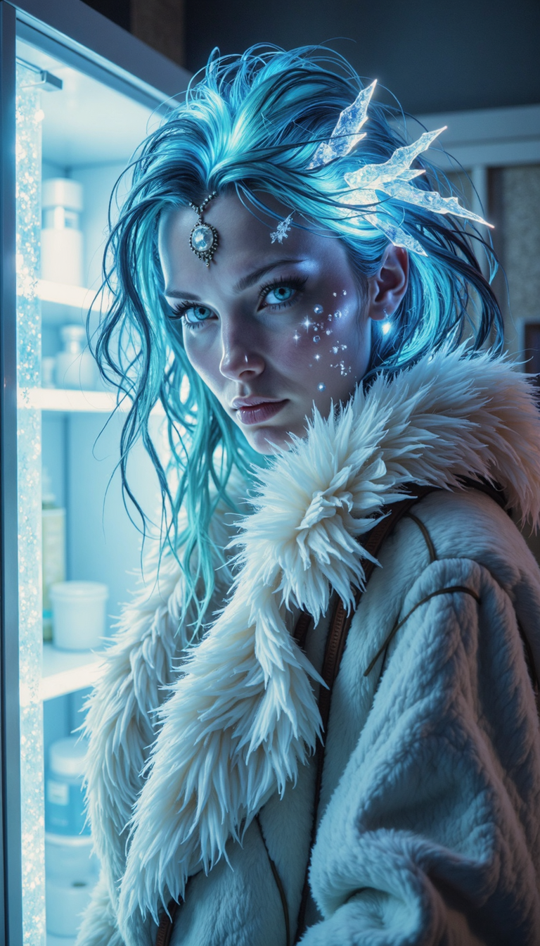 Bioluminescent, A woman with an androgynous physiognomy and cerulean highlights interwoven with glacial strands in her hair, clad in a voluminous pastel faux fur coat, stands ensconced within the gleaming, sterile confines of an open refrigerator. Her visage, with a diaphanous pallor, is partially obscured by crystalline icicles that cling precariously to her tresses and the fur of her coat, conveying a sense of arctic chill. The camera, positioned at a slightly low angle, captures a medium shot, emphasizing the juxtaposition of her ethereal beauty against the cold, metallic backdrop of the appliance. Her expression, a study in stoicism with a hint of petulance around the delicately glossed lips, suggests a narrative of glacial indifference or perhaps an ironic commentary on societal expectations of feminine docility. The lighting, seemingly emanating from the open refrigerator door, casts a cool, clinical luminescence, further amplifying the sensation of frigidity.