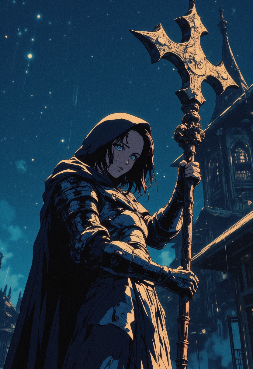 fantasy stylised illustration, anime style, rainy, wet, cinematic, close up, pale skin, smeared makeup, dynamic pose, perfect composition, covered in shadows thin person in a dark clothes, white clothes, mantle and cape, hooded, church top background, standing tall, short black hair, holding huge ornate cross in hand, intricate, midnight, starry skies, tight clothes, bright white stripes, muscular but thin hands, bulky armor on chest, chestplate, leans on the staff, looking down, expressive, crying expression, stature is agile and very graceful, woman, incredible, style of Edwin Austin Abbey, ne0nfant4sy,