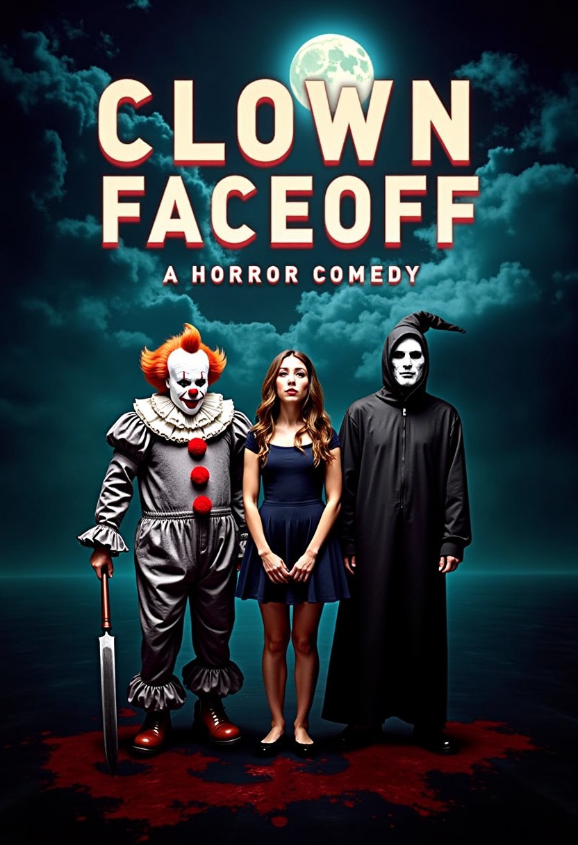 The poster features three comedic figures in horror movie attire - one wearing a clown costume, another dressed as a witch, and a third sporting a ghostly white face The background is dark and ominous, with swirling clouds of fog and a full moon looming large in the sky The title of the film is prominently displayed at the top, in bold letters: "Clown Faceoff" Beneath it are the words "A Horror Comedy", emphasizing both the horror and humor elements of the movie The poster's color palette is dominated by deep blues, purples, and greens, with splashes of blood red to add a sense of danger and suspense Overall, it creates an eerie yet playful vibe that will appeal to fans of both horror and comedy genres