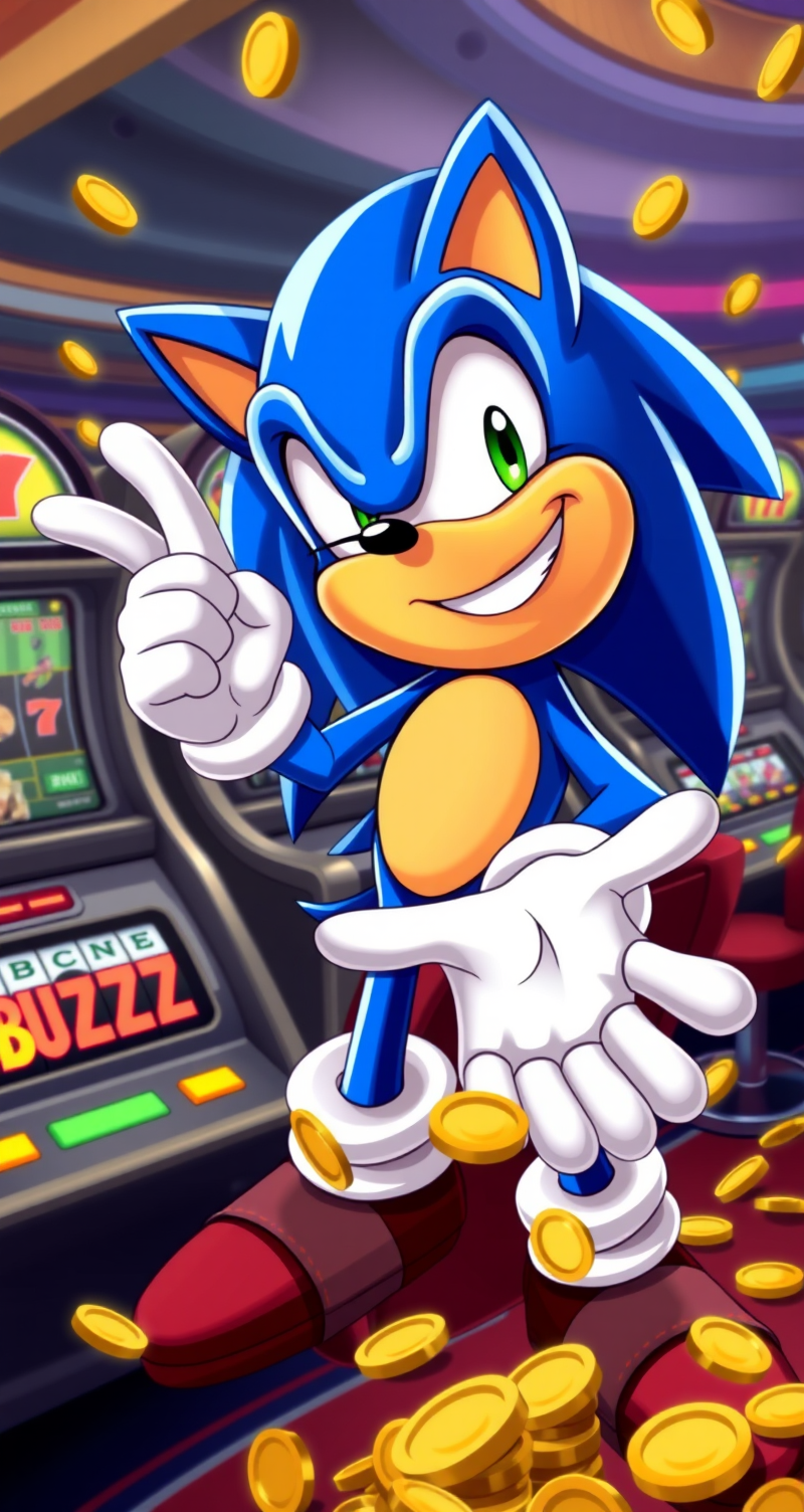 Sonic winks at the camera with a mischievous grin, one hand outstretched, palm open like he's expecting a shower of coins. Casino, slot machines with text "BUZZ", gold coins.