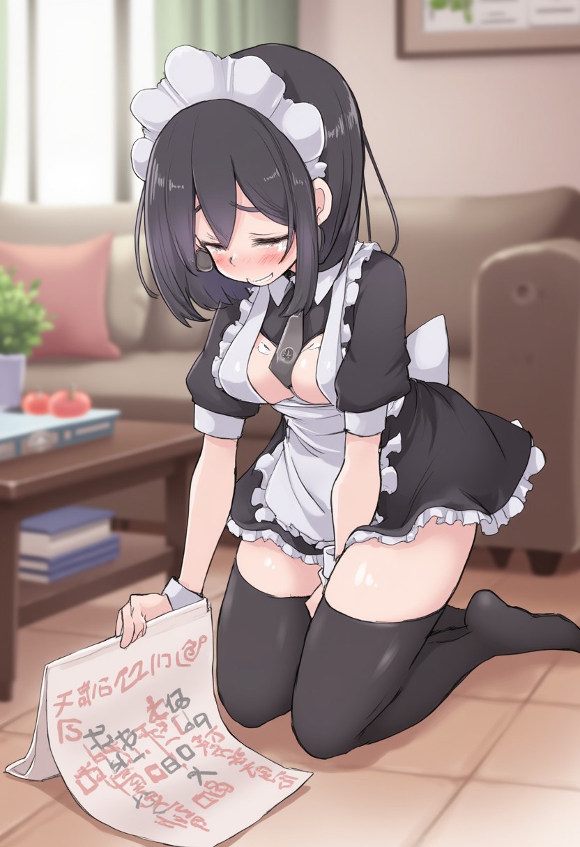 hd5,tnsk A beautiful woman kneeling on the ground of a living room. She has short black hair styled in a bob cut, amber eyes, and appears to be wearing a maid uniform with thighhighs and a maid headdress. The woman appears to be crying, while holding a sheet if paper that says "Flux Training Failed, Buzz PLS"