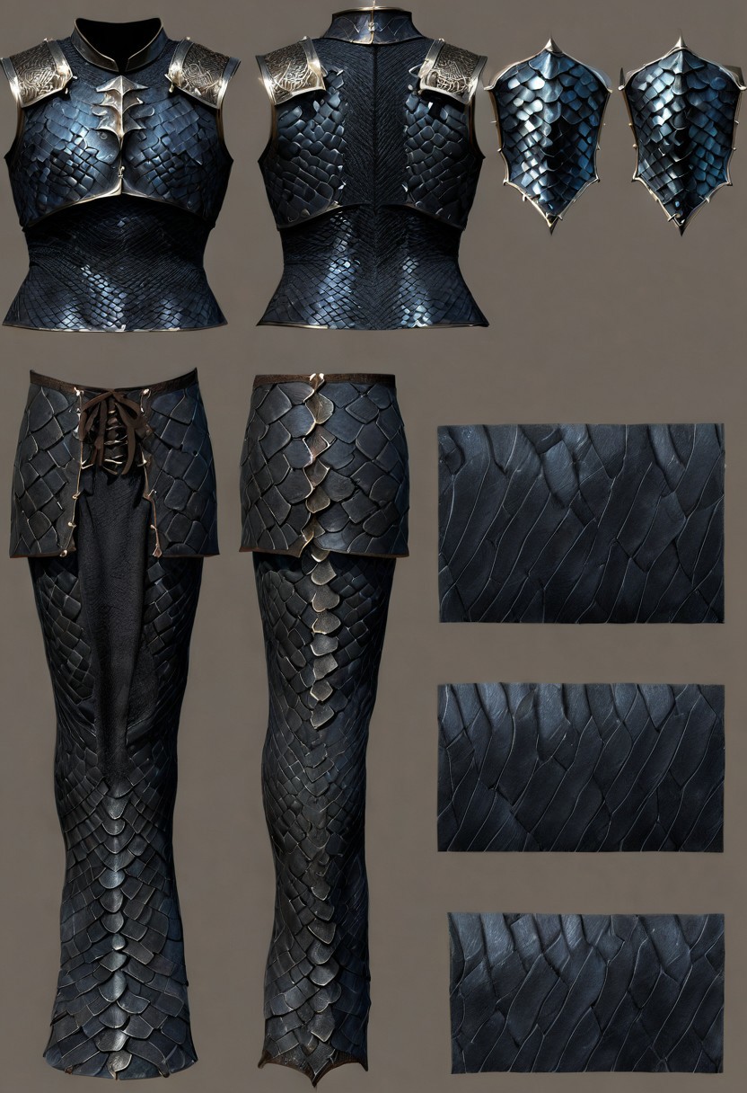 (((character sheet))), 2d flat texture, centered, frontal view,hyper-realistic, Realism, HDR, detailed, medieval warior style, Black obsidian-colored dragon hide, armour covered with Black obsidian-colored dragon scales, glowing, dragonborn scales, wet scales, black silk underwear, simple gray background
