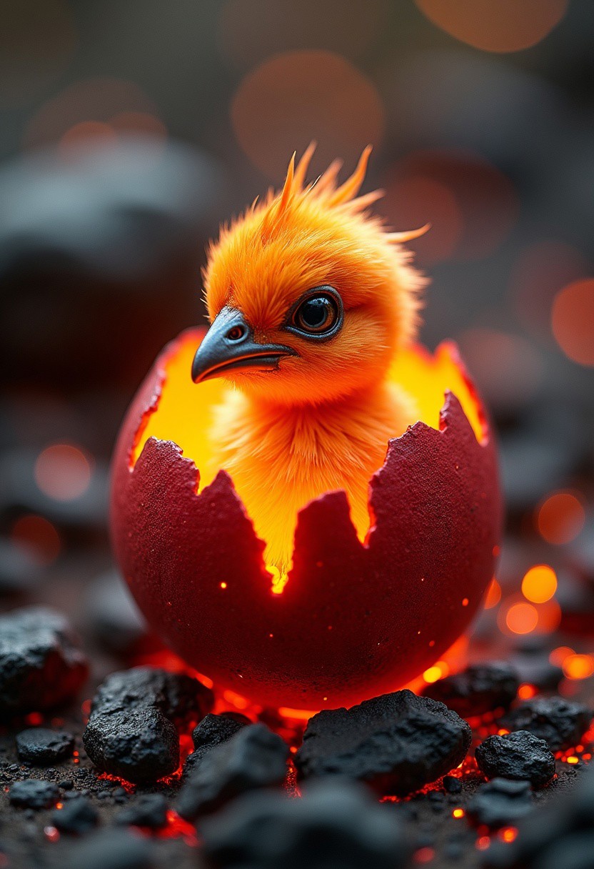 (masterpiece), best quality, expressive eyes, perfect face A small, crimson egg sits nestled among charred rocks, its surface glowing with an intense heat. From a large crack at the top, molten lava oozes out, cascading down the sides in fiery rivulets. The egg pulses with a rhythmic energy, each beat sending ripples through the molten flow. Emerging from the crack, a tiny phoenix chick struggles to break free. Its feathers are a brilliant mix of gold and red, shimmering with an ethereal glow. The chick's eyes, bright and curious, reflect the fiery landscape around it. As it spreads its delicate wings, small embers and sparks dance in the air, hinting at the powerful creature it will soon become. The scene is a mesmerizing blend of creation and destruction, a testament to the phoenix's legendary cycle of rebirth.