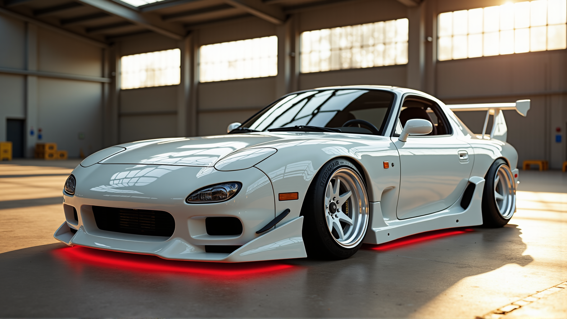 A highly detailed portrait of a 1993 Mazda RX-7, masterfully lowered and finished in immaculate white, white rims, white spoiler, and smoked headlights. The scene is set in an empty warehouse, where warm, filtered sunlight streams through expansive, slightly dusty windows, creating a dramatic interplay of light and shadows across the carâs flawlessly waxed, reflective surface. The car has a stunningly smooth white aftermarket front fender, bumper, and side skirts, enhancing its aerodynamic profile and elegant stance. The vehicle, turned off, exudes an aura of refined elegance. A full body red neon lighting kit under the car lights up the ground below. The image is captured with a 70mm lens, positioned at a chest-height quarter angle to emphasize the car's sculpted lines and contours. A circular polarizer is utilized to minimize harsh reflections and accentuate the clarity and depth of the carâs glossy finish. Add a touch of classic film grain to infuse a gritty, vintage texture into the image, blending a sense of raw authenticity with the precise details of the carâs design. This composition is meticulously framed to showcase every intricate detail, making this an award-worthy UHD RAW photograph, celebrated for its stunning realism, exceptional quality, and artistic grit.