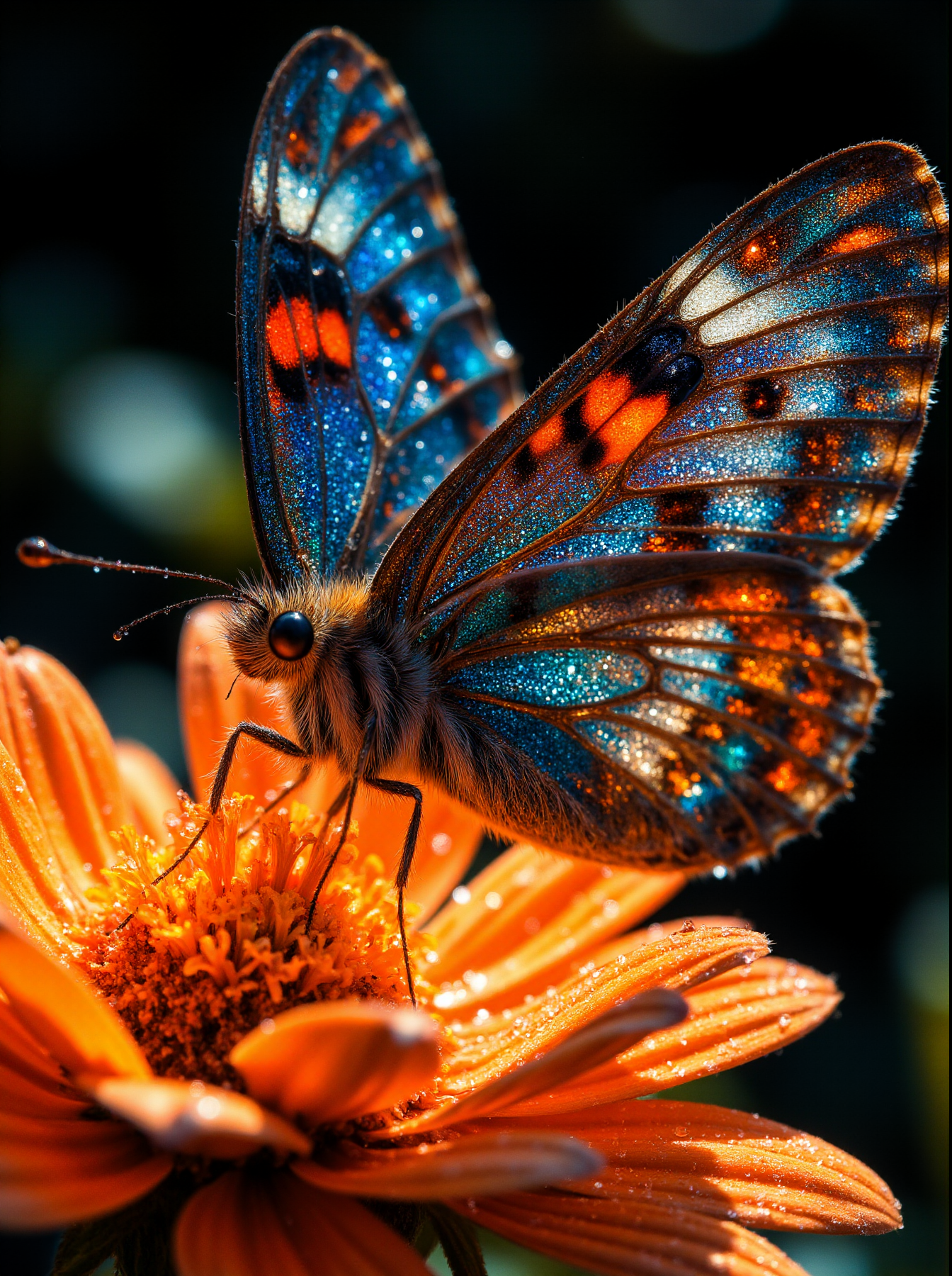 Macro Photography, highly detailed, intricate details, exquisite detail, The butterfly's wing, covered with scales, is like a scattering of precious stones. Each flake shimmers with multicolored shades, creating a complex pattern. The background shows the delicate petals of the flower to which the butterfly is perched.The dewdrops, the glare of the sun, rim light,natural light, bright colors. <lora:MidjourneyV6.1:1> <lora:Midjourney_Dreamlike_Fantasy_FLUX_LoRA:0.5> <lora:midjourney_whisper_flux_lora_v01:0.5>, close-up, macro 100mm, macro photography