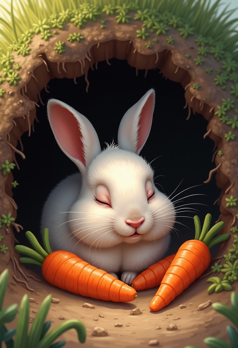 Sleeping rabbit in a burrow dreams of carrots. Digital painting in 128k reolution, natural colors, very detailled, detailled background