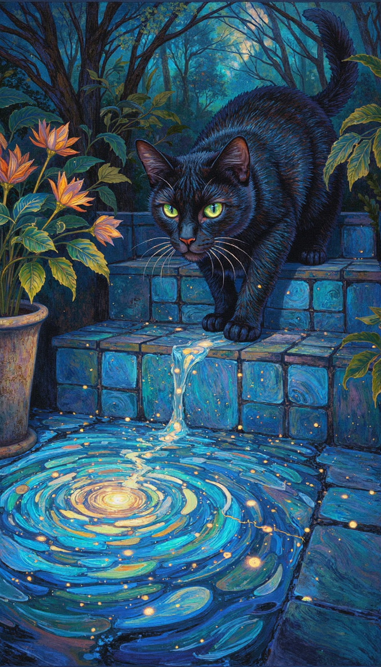 open_Impressionism,DIGITAL PAINTING,FLUORESCENT, GLOW,pointillist tetradic color dot technique,D4rch,fluidart style, scattered white dots, A black cat with mesmerizing, luminous green eyes cautiously descends tiled steps towards a pool of iridescent, luminescent liquid. The scene is captured in a low angle, medium shot, emphasizing the cat's descent and the otherworldly glow of the liquid. The background features a dreamy, out-of-focus garden bathed in the same ethereal light, creating a surreal and mystical atmosphere. The overall color palette is a vibrant, electric blue contrasted with the cat's dark silhouette, enhancing the feeling of magic. The texture of the tile and the fluidity of the liquid should be highly detailed. This fantastical scene could be enhanced with glowing particles in the air and subtle reflections of the liquid's patterns on the cat's fur.