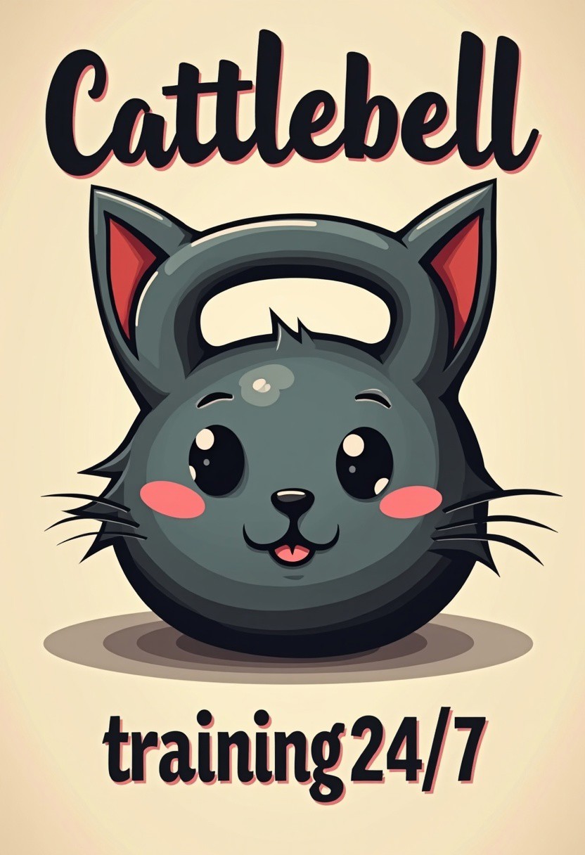 A gym flyer with a kettlebell in the shape of a cute cat head. Text below reads "Cattlebell training 24/7"