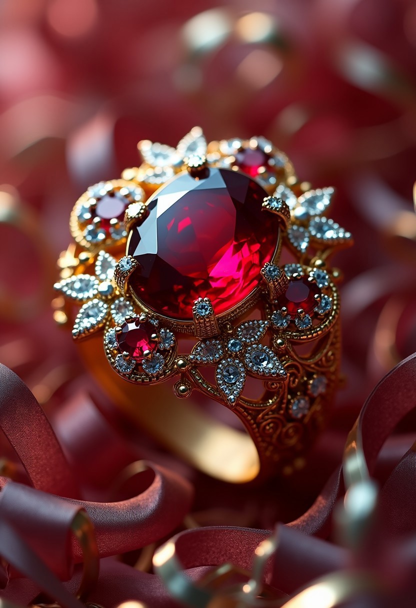 A close-up of an intricate (ornate ring) adorned with (brilliant red gemstones) set in (luxurious gold and silver filigree). The (red gems) glisten under the soft light, their facets reflecting deep ruby hues, while the (exquisite craftsmanship) of the metal details creates a sense of (royal elegance). Surrounding the ring are [delicate floral patterns] made of silver and crystals, adding a layer of (refinement and luxury) to the composition. The background is filled with swirling (metallic ribbons) of red and silver, creating a dynamic yet balanced contrast. The (lighting effects) emphasize the shine and brilliance of the gemstones and the reflective surfaces, highlighting the (intricate detailing) and (majestic beauty) of the design. The overall mood is one of (opulence and sophistication), with every element contributing to the sense of (high craftsmanship and artistry).