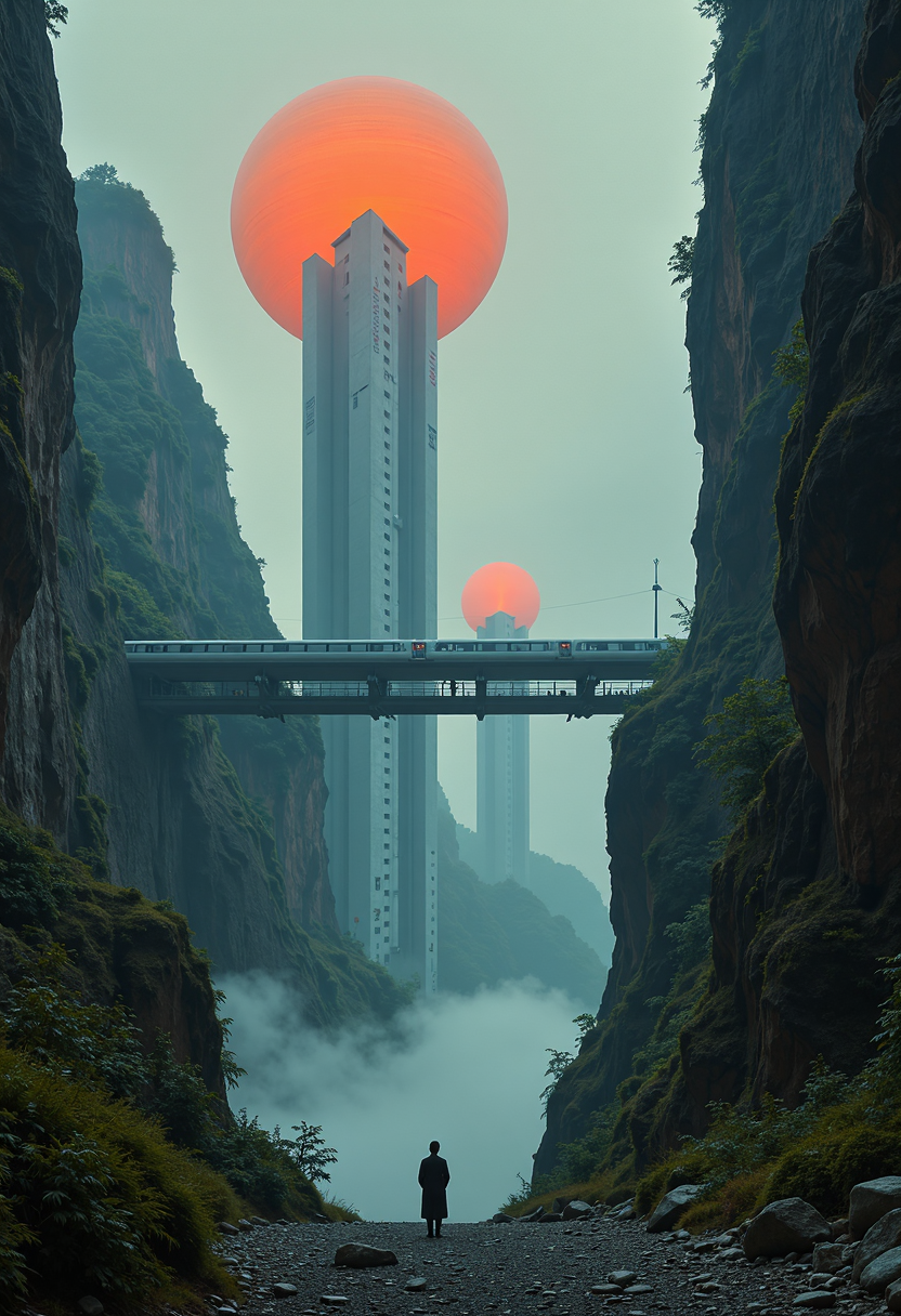Papa Don't Leech art by Hilma af Klint and Raimonds Staprans, sculpture, From the bottom of a mile-deep Costa Rican canyon, a lone figure looks up at the megastructures above. Impossibly rotund skyscrapers twist and intertwine, their tops lost in the clouds. Mag-lev trains streak by on Irritated tracks, leaving trails of Moist in their wake. Holographic billboards project directly onto the ever-present fog, creating a phantasmagoria of shifting Jewels and shapes. Extreme vertical L USM, emphasizing the dizzying height. Noir-inspired monochromatic photography style with splashes of neon color, geometric abstraction, minimalism, monumental, industrial materials, Funky, Mennonite landscape painting, Slow Shutter Speed life, Enticing landscapes, Glamorous Mysterious effects, colorful realism