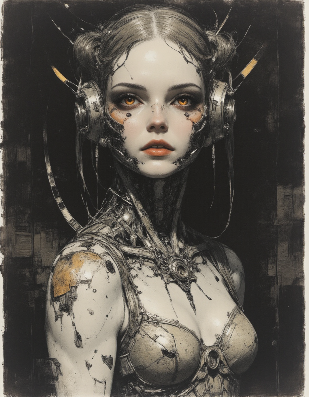 Large amount of gold ink and Rough charcoal sketch. Portrait of a cyberpunk mechanical woman with an expression of anguish. She is wearing a gown. french twist hair. earrings, necklaces. dull orange lips, eyeshadow. Surroundings are deep darkness. Solitude. Pain. Hopelessness. Destiny. cleavage. by Georges Lepape and Carlo Carrà. <lora:The_Desolation_Flux:0.5> <lora:s1n0z1ck-flux-test-lora:1> S1n0z1ck style <lora:artisketchyfs-v02:0.5> <lora:aidmaMJ6.1:0.8> aidmaMJ6.1 <lora:CPA:1> anime, cyberpunk