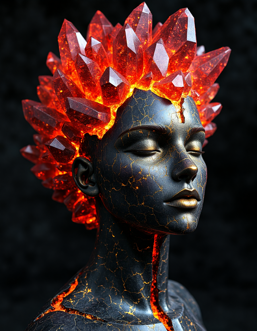 extreme closeup, cinematic bust of a human head. The head is made of dark gold, black marble stone, with intricate gold cracks revealing glowing lava beneath. The face features realistic human characteristics, with closed eyes and a serene expression. Adorning the head are enormous, translucent red crystals, protruding at various angles, resembling a crown or natural growth. The background is dark and moody, ensuring the vibrant colors of the lava and crystals stand out, <lora:aidmaMJ6.1_v0.3:1>