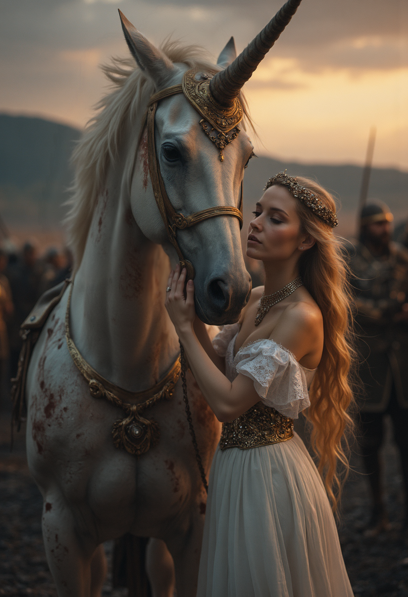cinematic film still breathtaking In the aftermath of a fierce battle, the Fey Enchantress stands beside her majestic unicorn, its head and horn stained with the blood of their enemies. She is beautiful young French woman, wearing a flowing white lace dress with ornate embroidery ,her skin glows with a holy aura, a Laurel wreath on her head, a golden girdle around her waist, ethereal, her hair is blonde , Her hands glow with a soft magical light gently brushing the unicornâs mane as she heals and soothes it, her expression both serene and sorrowful. The magical regal unicorn wearing a saddle, once pure white now covered in blood, its horn now tainted by the blood of those who fell before it. The enchanted beast lowers its head toward the Enchantress, trusting in her gentle touch, while the air around them hums with lingering magic, the unicorns head and horn are covered in vast amounts of blood highly detailed background <lora:artisketchyfs-v02:0.5> . award-winning, professional, highly detailed . shallow depth of field, vignette, highly detailed, high budget, bokeh, cinemascope, moody, epic, gorgeous, film grain, grainy