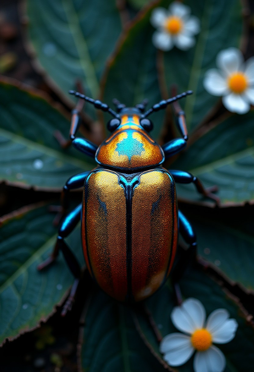 angle from above of a flawless Flea Beetle that embodies the magic of its surroundings with striking colors and intricate patterns adorn its shell that can emit a soft glow and create mini whirlwinds, Winter, Cyber Noir, it is nestled in a lush, vibrant forest filled with glowing flowers, Ethereal Lighting, Film Washi, by Thomas Lawrence, Hajime Sorayama, very inspirational, lush, very, very coherent, highly enhanced, perfect symmetry, glossy, delicate, dynamic background, ck-fntstcl