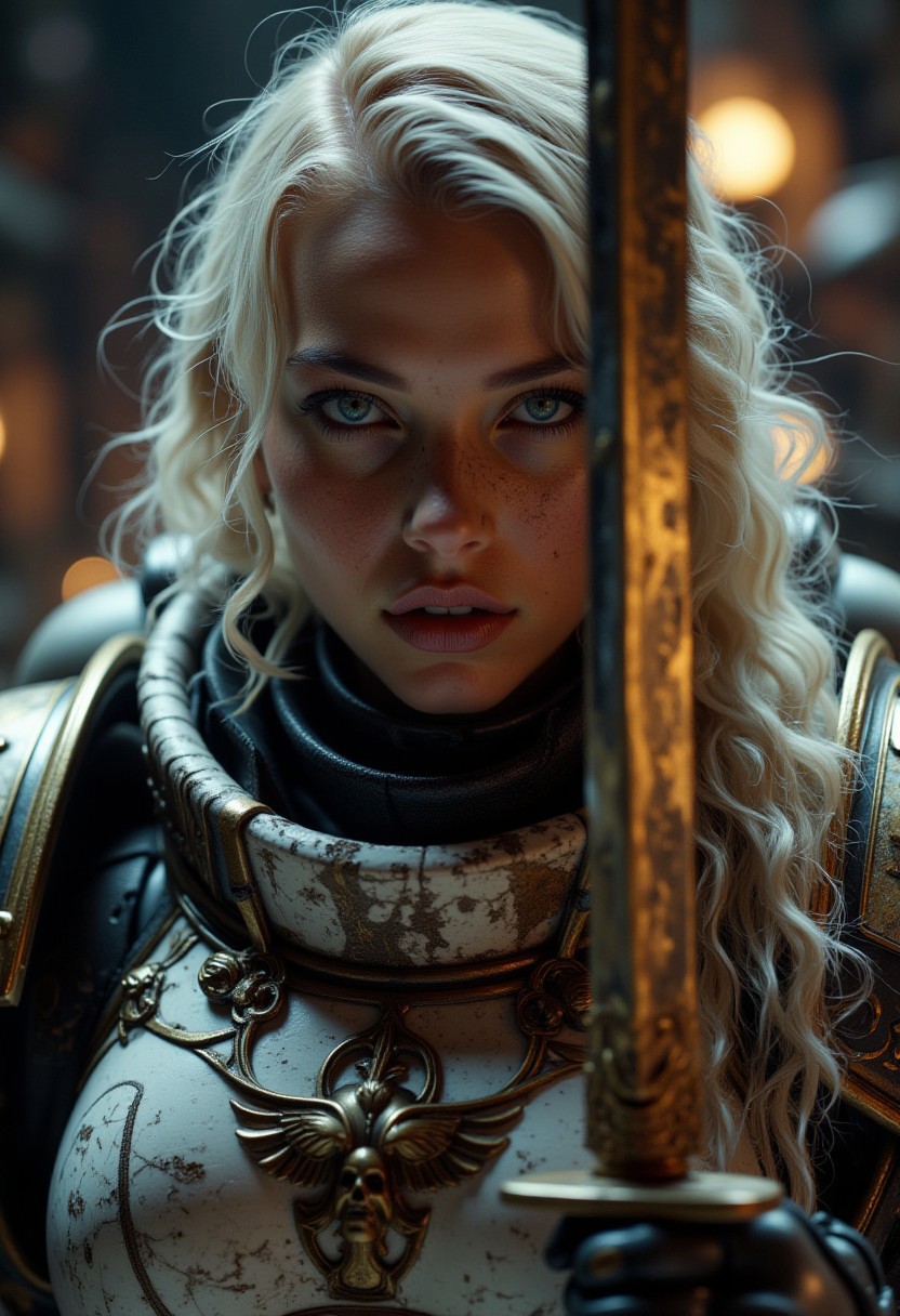 cinematic film still, close up, female WhiteS40K holding a sword, clad in power armor. long blonde hair, with rich, vibrant colors and meticulous textures for her power armor, vignette, highly detailed, bokeh, moody, epic, film grain, grainy