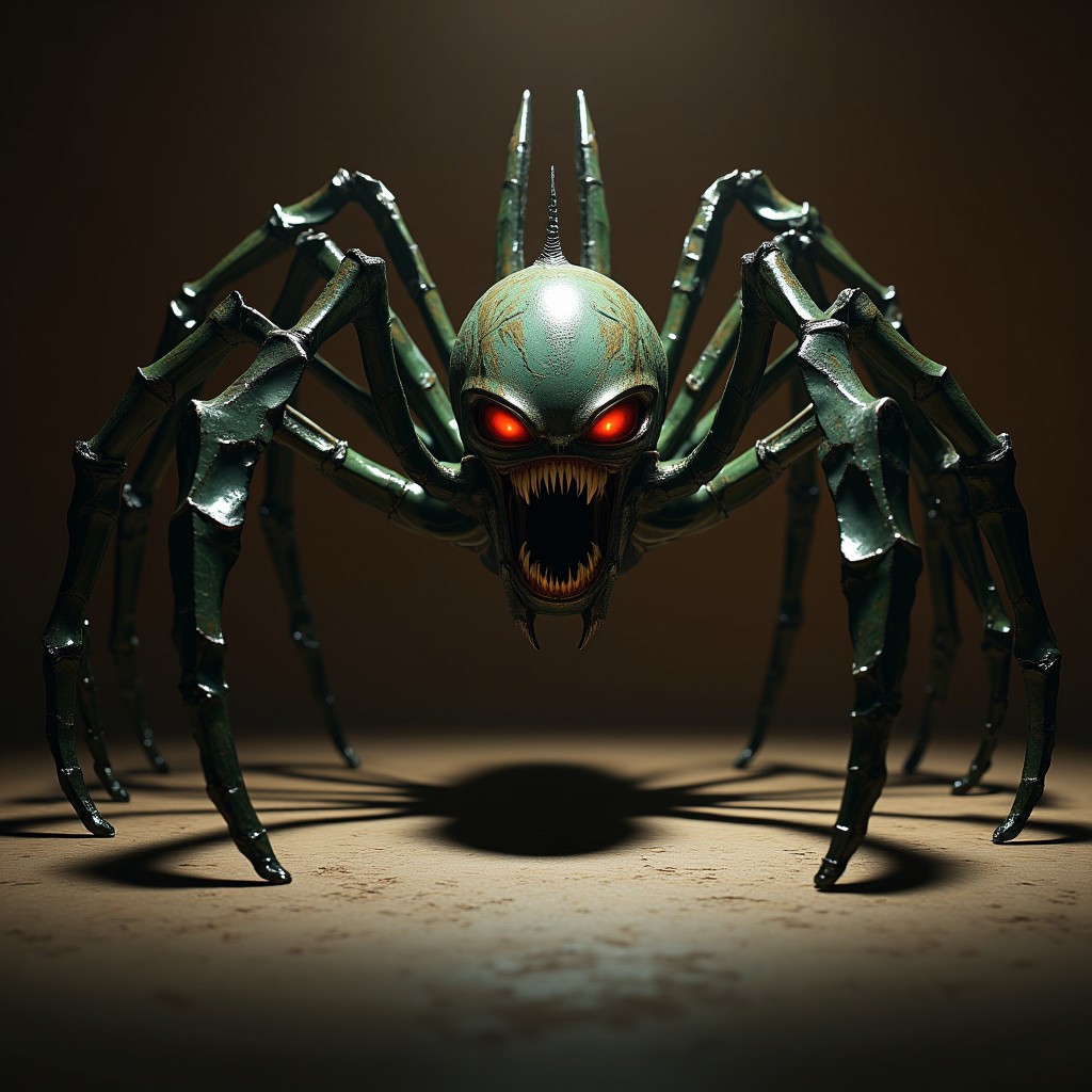 A grotesque, biomechanical creature dominates the scene, its spindly, spider-like frame casting ominous shadows in a dim, gothic atmosphere. Its jagged, helmet-like head looms forward, reflecting a metallic sheen in the dim, eerie light, the mottled green of its exoskeleton gleaming faintly. Six long, segmented legs end in razor-sharp claws, gripping the ground with a menacing poise. The creature's humanoid face is twisted in a grimacing snarl, its wide, tooth-filled mouth half-open as if ready to strike. Glowing red eyes burn with malevolent intensity, fixed directly on the viewer, while a long, pointed appendage juts unnervingly from the back of its head, pulsating as if alive. The creature's head tilts slightly downward, as if observing its prey with malicious intent. A faded brown gradient serves as the backdrop, minimalistic yet enhancing the sinister aura, while an unseen light source casts sharp, angular shadows, amplifying the sense of otherworldly horror. The overall mood is cinematic, steeped in gothic dread, evoking a profound sense of menace and unnatural terror",aidmaMJ6.1