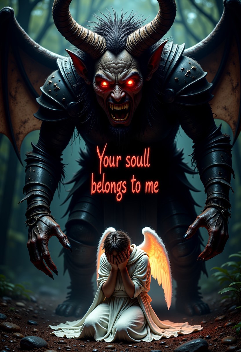 Frontal close-up: a tense scene, a demon towering over a frightened angel. (Text Your soul belongs to me) demonic face filling the frame, aggressive expression, sharp claws raised menacingly, partially visible webbed wings, worn dark armor, curved horns. Angel in protection, on his knees, one knee on the ground, the other knee bent, a hand covering his face, fragile and vulnerable, wings with white feathers, a torn glowing mantle. Cinematic lighting, dramatic shadows, extreme close-up, emphasizing facial expressions and details --ar 4:5 --stylization 400 --v 6/Angel, cinematic lighting, close-up, Demonic, dramatic shadows, tense scene, v 6