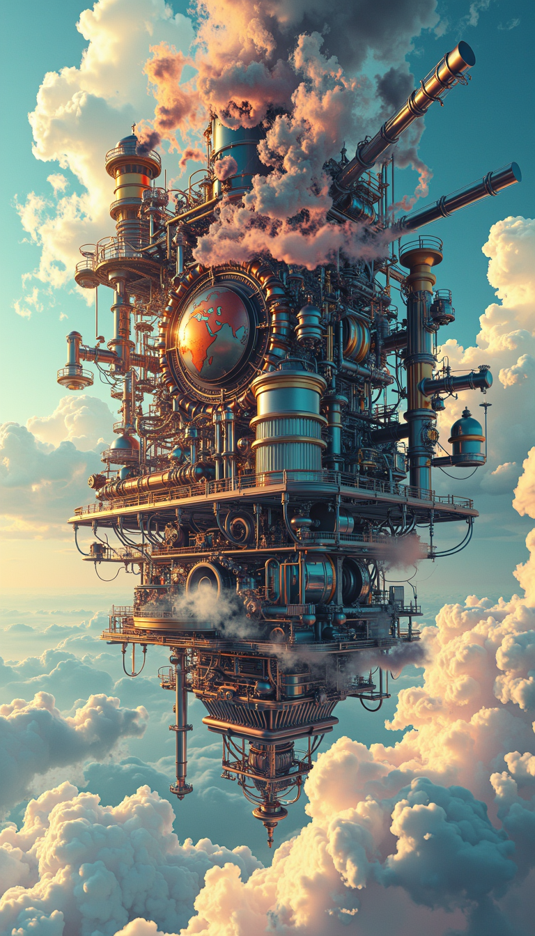 An intricate, steampunk-inspired illustration of a "Weather Factory" controlling Earth's climate. Visualize a massive, Victorian-era industrial complex floating in the sky, with giant brass gears, steam-powered pistons, and elaborate pipe networks. Show different sections for manufacturing various weather phenomena - a freezing chamber creating snowflakes, a pressurized storm brewing department, and a solar-powered heat wave generator. Include tiny weather workers: cloud sculptors, wind wranglers, and rainbow painters. Depict the factory's connection to Earth with massive tubes funneling weather patterns to different regions. The color palette should blend rich, warm metallic tones with the vibrant hues of weather elements - electric storm blues, sunset oranges, and misty grays. Add whimsical details like a quality control department testing perfect raindrops and a research division experimenting with new weather types.