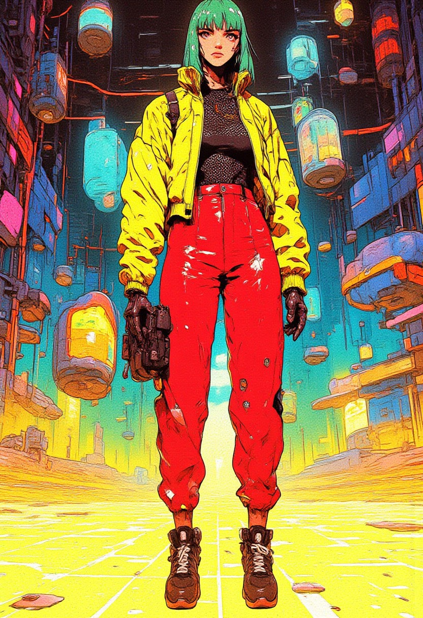 A hyper-detailed, semi-realistic anime retro cyberpunk full-body shot of a striking woman with vibrant green hair styled in a short French bob, her hair sleek and shiny under the neon lights. She wears edgy netted clothing, Yellow latex jacket, red high waist sports trousers, black high ankle sneaker boots, accentuating her tanned skin and giving off a futuristic, rebellious vibe. The metallic textures of her outfit catch the light, reflecting the iridescent glow from the floor beneath her. The floor shimmers with yellow, sky blue, and orange hues, creating a vibrant yet surreal atmosphere. Surrounding her are eight surreal, abstract objects that float mysteriously in the background, their shapes bending reality with cyberpunk aesthetics, adding to the dreamlike, futuristic setting. The blend of retro and futuristic styles, combined with the sleek textures and neon-infused lighting, creates a visually captivating scene. <lora:Cyberpunk Anime Style:1>. <lora:CPA:0.93> <lora:anime_martzv2:0.53> anime_martz, <lora:RetroAnimeFluxV1:0.33>