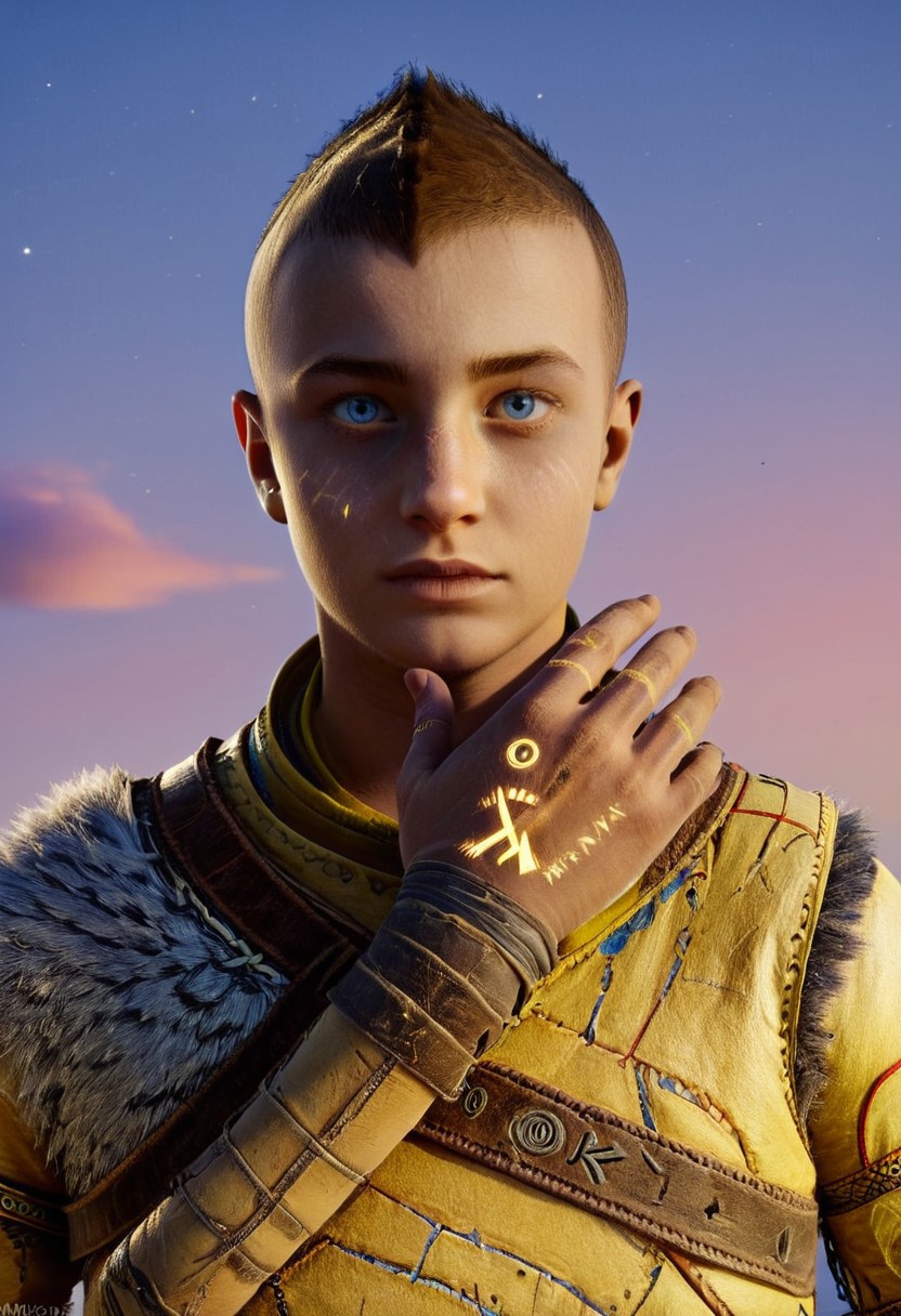 Highres, masterpiece, very realistic, Stunning realistic photo portrait, stunning aurora, sunset, (front view), blue eyes, detailed face, freckles, 1boy, solo, portrait, Atreus, wearing yellow warrior outfit, detailed skin, realistic skin, dramatic angle, (glowing magic yellow rune tatoo on forearm)
