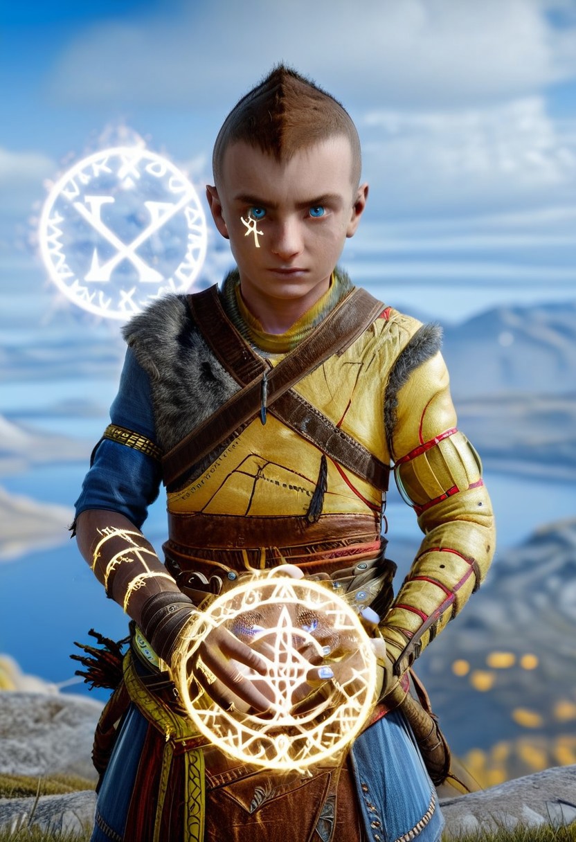 , 1man, Atreus wearing.yellow warrior outfit, casting a spell, glowing runes magic, blue eyes, natural landscape, glowing magic runes on his fingers, bow on his back