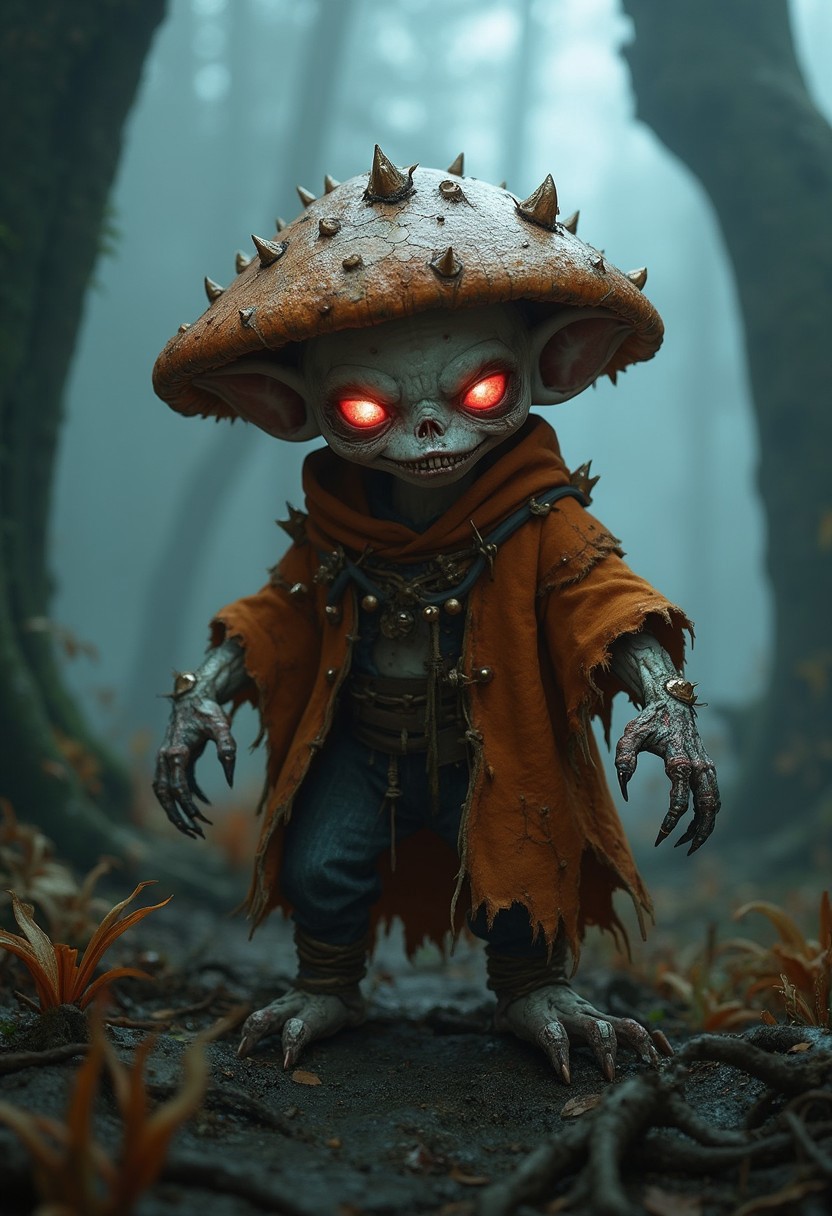 A professional photo of a menacing mushroom goblin standing in a foggy forest. The goblin is small but exudes an ominous presence. Its skin is pale, almost white, with deep wrinkles and dark shadows, giving it a lifeless, eerie appearance. Its piercing red eyes glow with a malevolent intensity, while small, sharp teeth peek out from its gnarled mouth. The goblin wears a dark orange, weathered cloak resembling a mushroom cap, with detailed textures showing small, fungal growths and spikes emerging from its surface. The cloak is tattered, with jagged edges that add to its sinister look. Long, spindly fingers protrude from the goblin’s sleeves, ending in sharp claws, poised as if ready to attack. The background is a dense, mist-filled forest with towering, twisted trees barely visible through the thick fog. The ground is damp and covered in decaying leaves and fungi, enhancing the atmosphere of decay and gloom. The faint glow of the goblin’s eyes is the primary light source in the dim setting, casting eerie shadows on the surrounding environment. The composition highlights the contrast between the dark, foreboding forest and the glowing figure of the goblin,4k,uhd,RPG Style