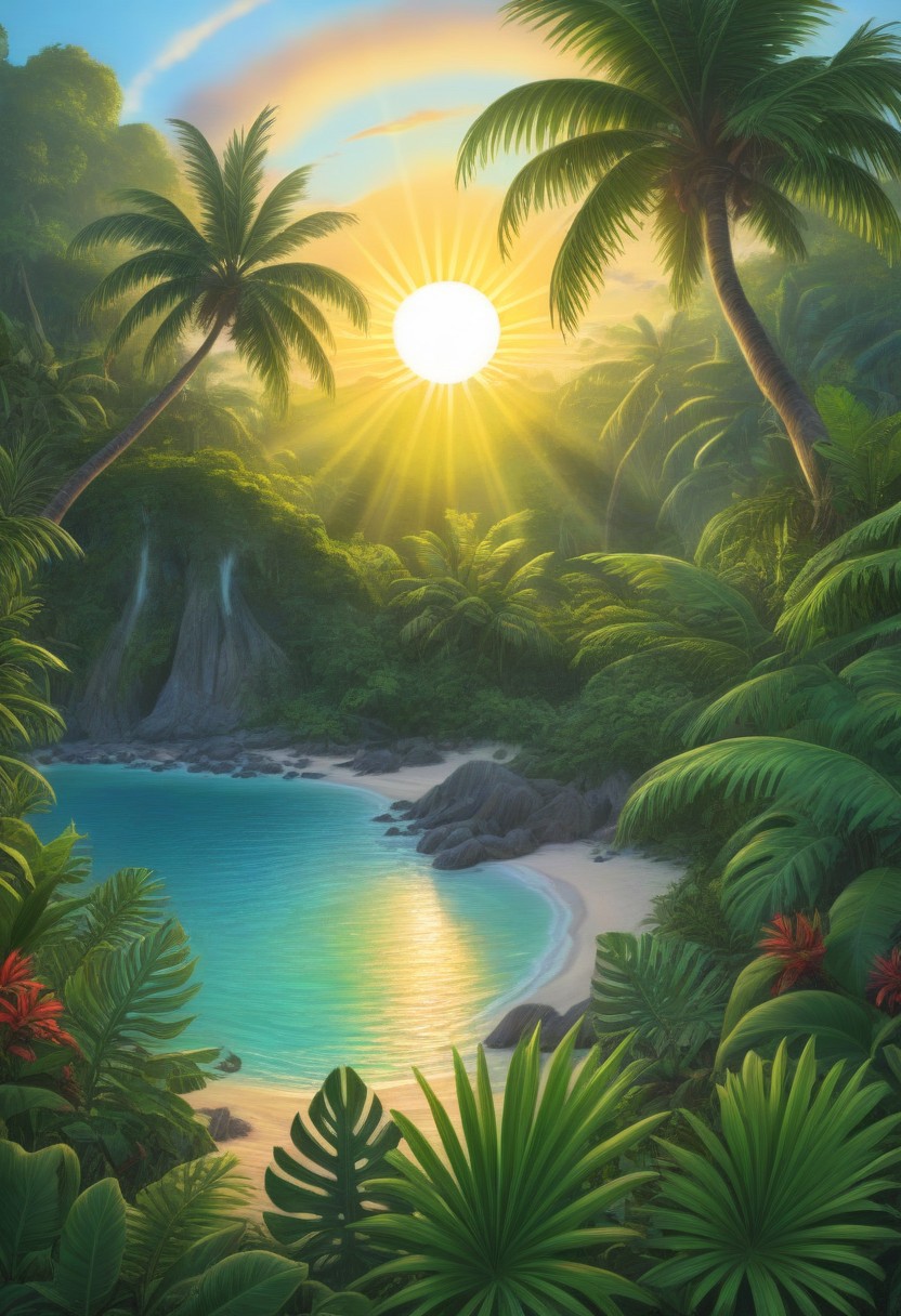 Detailed illustatuin of a paradisiac landscape, a relaxing tropical island, sun rays, vibrant colors, relaxing, primeval. nature, intricate details