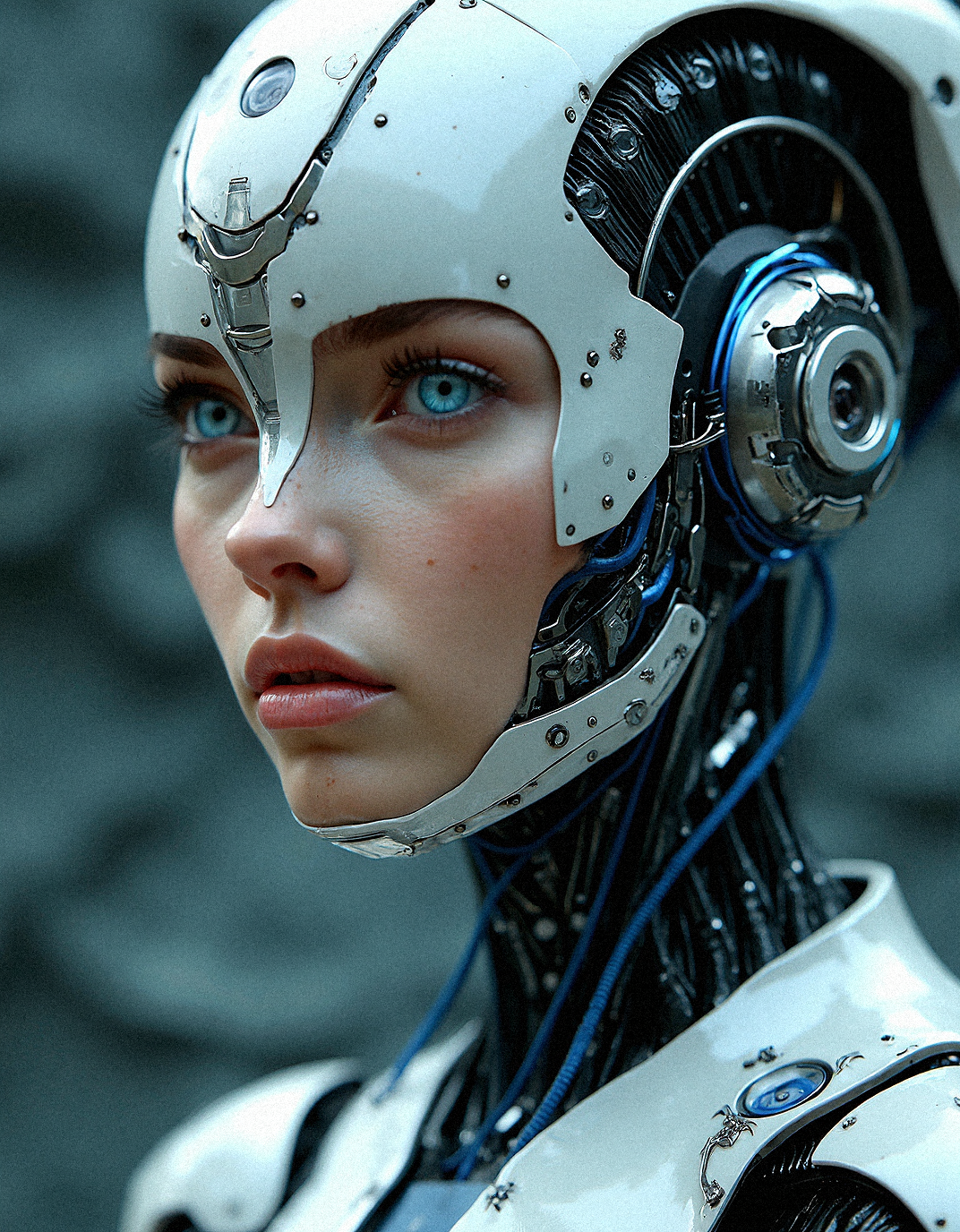 Imagine a hyper-detailed portrait of a female android with meticulously crafted cybernetic features, integrating advanced materials that exhibit both strength and flexibility. Her face is a blend of human softness and mechanical precision, with metallic components and intricate wiring interwoven into her skin. Her eyes, shaded with a deep blue, glow with a subtle but intense light, reflecting intelligence and a sense of purpose. Her head and neck are adorned with silver and blue metal plating that is sleek, polished, and connected by thin, woven wires. Along her jawline and forehead, micro-wires are elegantly arranged, hinting at both functionality and beauty. The background showcases a highly textured, carbon-fiber-like material with wave-like patterns, symbolizing the advanced technology that is part of her being. These textures seem to merge with her armor, suggesting a seamless fusion of body and material. The lighting emphasizes the curvature of her metallic parts, casting gentle shadows that bring depth to her features. This image represents a futuristic concept where artificial beings embody both strength and grace, transcending the traditional boundaries of human and machine.