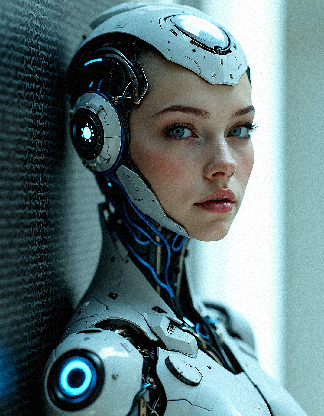 Imagine a hyper-detailed portrait of a female android with meticulously crafted cybernetic features, integrating advanced materials that exhibit both strength and flexibility. Her face is a blend of human softness and mechanical precision, with metallic components and intricate wiring interwoven into her skin. Her eyes, shaded with a deep blue, glow with a subtle but intense light, reflecting intelligence and a sense of purpose. Her head and neck are adorned with silver and blue metal plating that is sleek, polished, and connected by thin, woven wires. Along her jawline and forehead, micro-wires are elegantly arranged, hinting at both functionality and beauty. The background showcases a highly textured, carbon-fiber-like material with wave-like patterns, symbolizing the advanced technology that is part of her being. These textures seem to merge with her armor, suggesting a seamless fusion of body and material. The lighting emphasizes the curvature of her metallic parts, casting gentle shadows that bring depth to her features. This image represents a futuristic concept where artificial beings embody both strength and grace, transcending the traditional boundaries of human and machine. Leaning against the wall with both hands behind her back, her body slightly turned, as she gazes softly at the viewer.