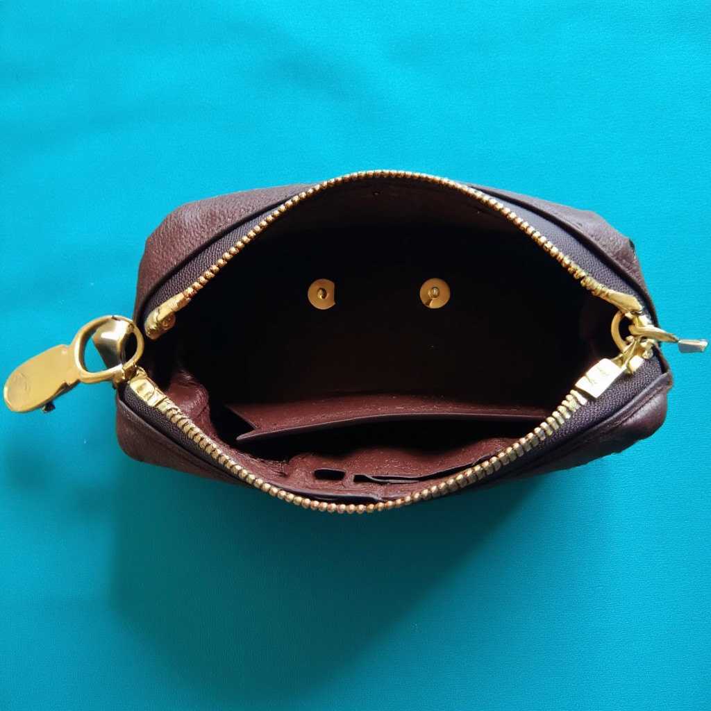 A pareidolia image of a sad face made by an empty open coin purse laying on a cyan cloth table. The coin purse has golden clutches and brown leather. The dominant colours of the image are deep rich cyan and gold.