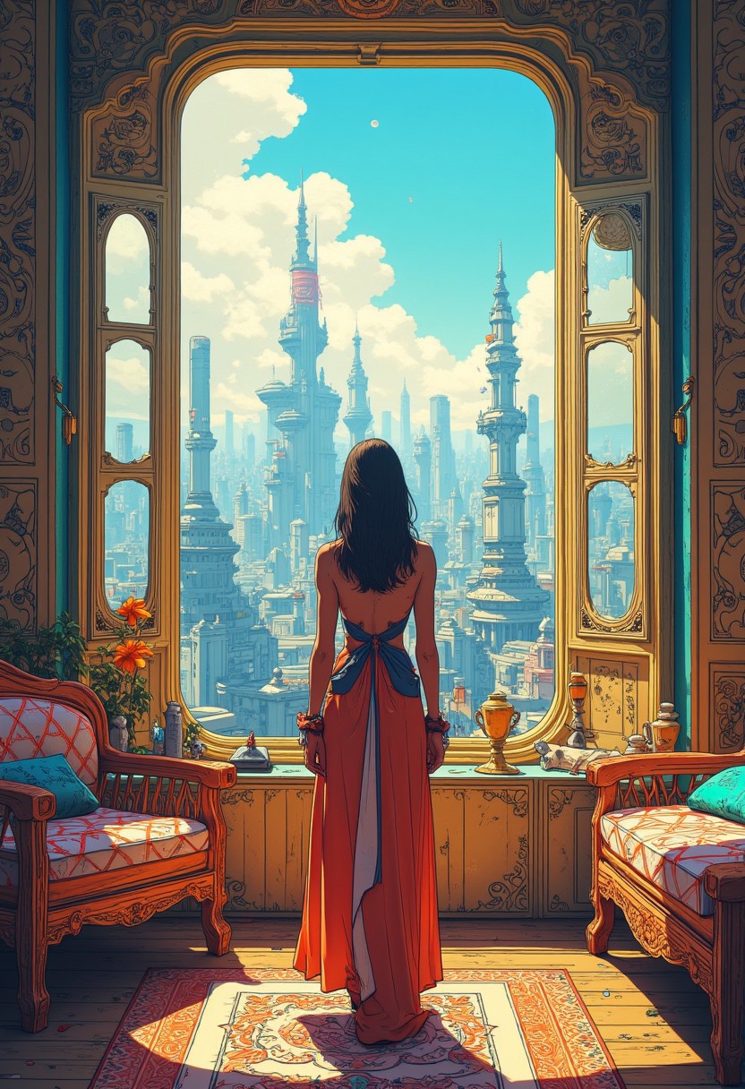 A woman dressed in a stylish dress stands in a room with large windows. The room is furnished carved furniture. The window looks out on a solarpunk forest city. The scene is reminiscent of the works of artists like Syd Mead, Simon Stalenhag, and Rovina Cai, with a vibrant, solarpunk aesthetic, rich in intricate details and textures. cyberpunk