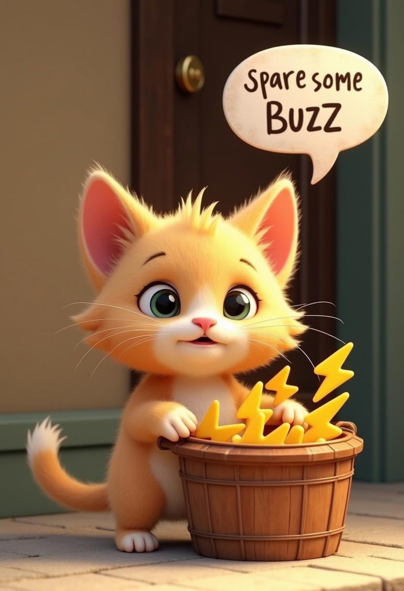A cute innocent cartoonish realistic 3d kitten, holding a basket in its paws, bucket has a few with (yellow foam lightning bolt buzz icons) in it, standing at the door outside the house, speech bubble above it saying "spare some buzz" text legibly written