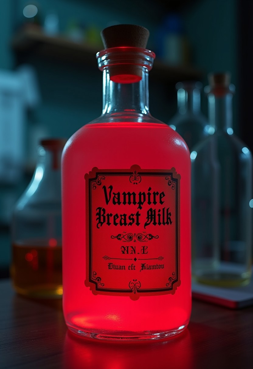 Create Ultra hyper-realistic and hyper detailed UHD HD.of a glowing red liquid inside a decanter bottle, fancy paper label on the outside, text "vampire breast milk" in fancy cursive script, the bottle appears to be in a laboratory