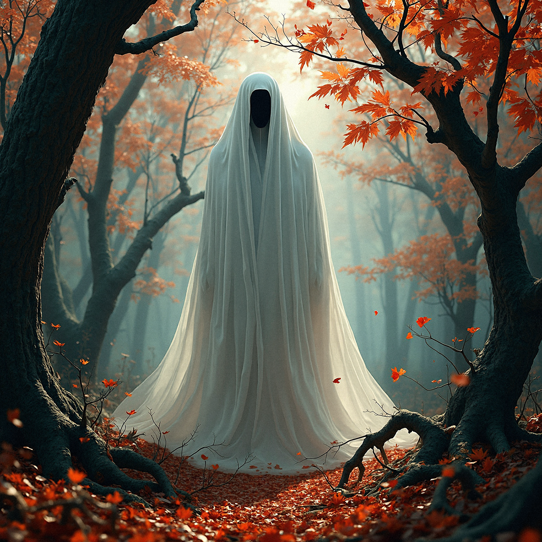 a highly detailed and realistic ghostly scene in an ancient forest bathed in autumn hues. The ghost is draped in a flowing white cloak, which covers it entirely, leaving only deep black eyes and a small, shadowed mouth visible. The forest is filled with twisted, gnarled trees, their branches bare except for scattered red and orange leaves, which add vibrant splashes of color against the spectral figure. The trees' bark is textured and aged, telling tales of time, while the background bathes the scene in warm tones of red, orange, and brown. The ghost appears to float gently above the forest floor, with shadows subtly cast by the soft, diffuse light that filters through the trees, adding depth and an eerie tranquility. The scene feels like a fleeting glimpse into an enchanted, melancholic world, where the ghost silently inhabits the quietude of the autumn woods.
