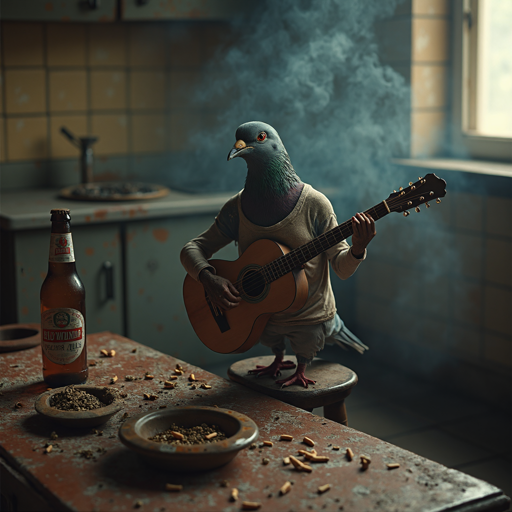 In a dimly lit Soviet-era kitchen, the air is thick with smoke, and cigarette butts overflow from ashtrays scattered across the table. A half-finished bottle of beer sits next to a pile of sunflower seed husks. On a worn wooden stool, a grimy, smoke-stained pigeon perches, wearing a greasy, stained undershirt. Its beady eyes squint as it strums a beat-up guitar, filling the room with a melancholic tune. The peeling wallpaper and yellowed tiles add to the gritty, rundown atmosphere of this surreal scene.