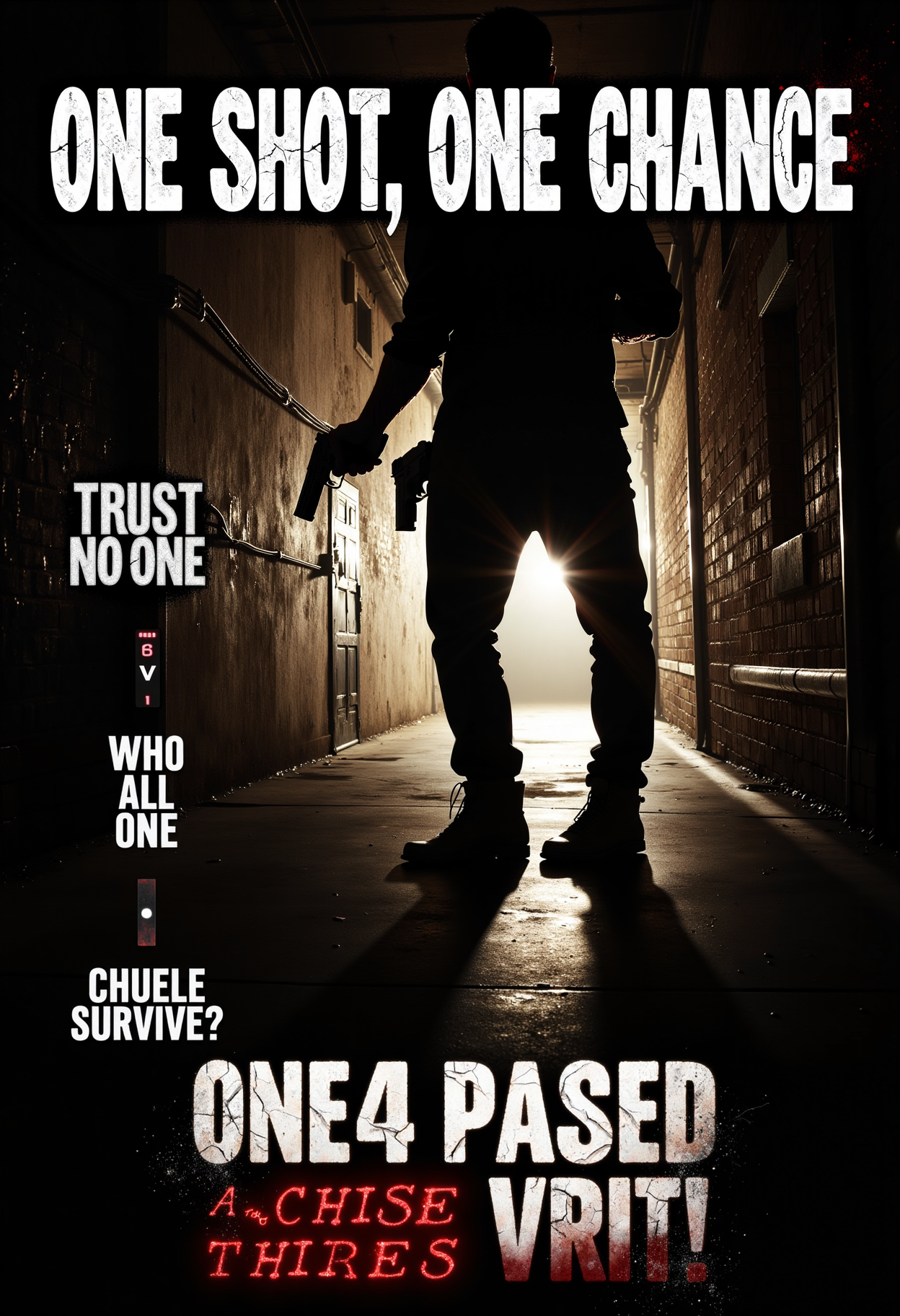 A tense standoff in a dimly lit alley, where a detective holds a gun pointed toward an unseen figure in the shadows. The detective’s face is partially lit, sweat dripping down his forehead. Top: "One Shot, One Chance" in bold, cracked white font. Bottom: "Trust No One" in small glowing red text. Left: "Who Will Survive?" in a thin white font. Right: "The Chase Ends Here" in bold, jagged black letters. High contrast, film noir lighting, with gritty textures and intense mood.