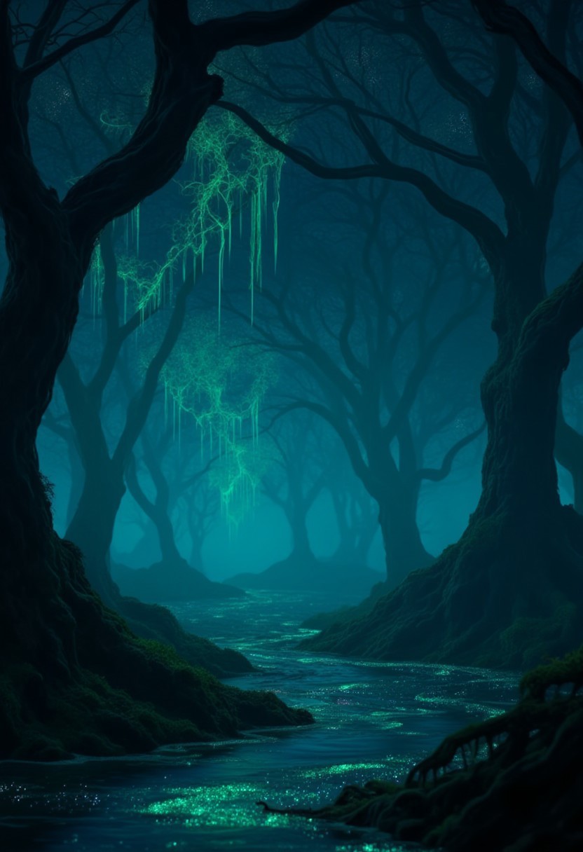shenhai, liquid particles glowing, A dark, eerie swamp where the air is filled with glowing, ghostly blue and green particles, resembling will-o'-wisps floating above the murky water. The trees are twisted and gnarled, their branches draped with strands of glowing particles that hang like spectral vines. The ground is covered in a thin layer of fog, with phosphorescent particles swirling lazily within it, casting an eerie glow across the swamp. The water reflects the glowing light, creating an unsettling but mesmerizing effect.