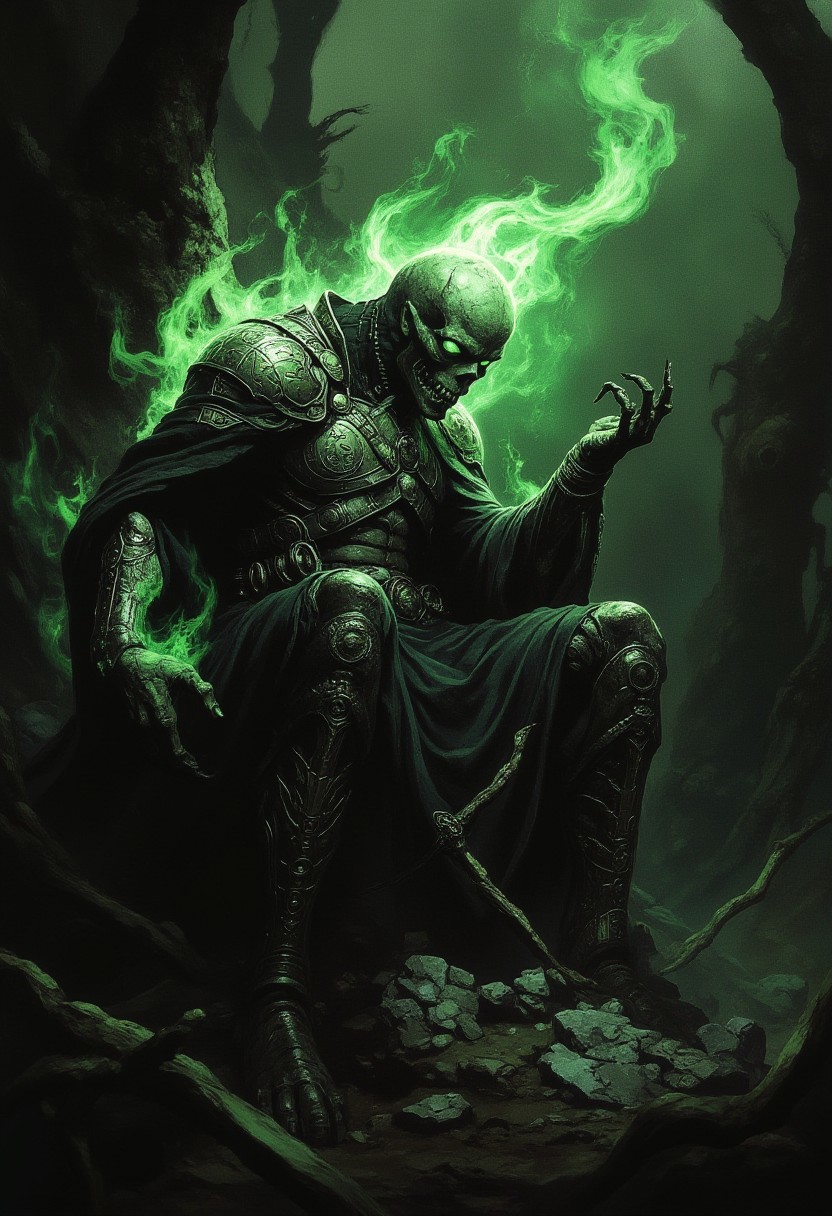 Frank Frazetta fantasy oil painting, R3tun4L style, skelenecro, cinematic lighting, insane details, close-up, 64-megapixel DSLR. scene in a sketch-like style with thick, bold lines. The focus is a close-up of a charming skeleton necromancer’s skull, engraved with glowing eldritch symbols that blend medieval magic and futuristic sci-fi. His hollow eye sockets blaze with green and black eldritch flames. wears ancient rusted heavy medieval armor. The glowing runes on his bones pulse with energy, radiating a dark power. Atmospheric haze surrounds the scene, heightening the contrast between the deep blacks of the background and the vibrant flames of his eyes. eerie misty dark forest cemetery background