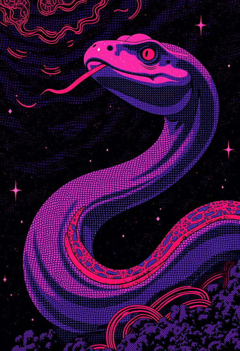 ne0nfant4sy abstract digital art, glitched big snake, intricate dot and line patterns, purple and black background, wavy patterns, surreal, hypnotic, otherworldly, fluid motion, high contrast, minimalistic, dark background, vibrant colors, psychedelic, low-angle_view. (epic dark fantasy style).
