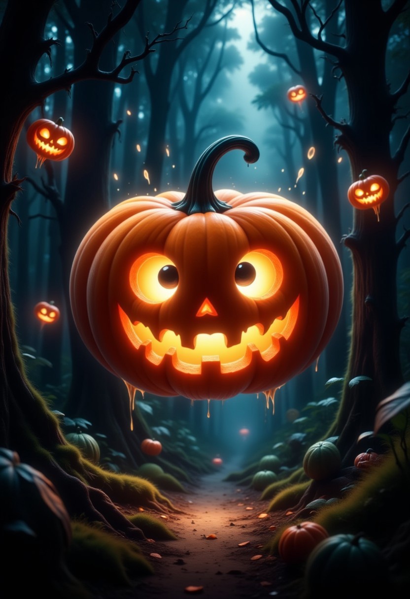 cute chibi pumpkin with huge eyes flyling through a dark forrest
