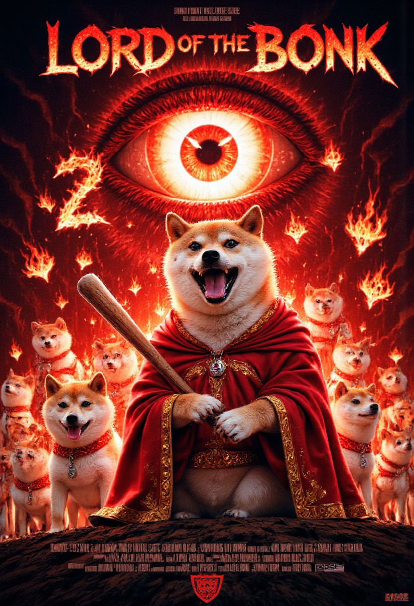 High fanatasy movie poster in The mythp0rt style for o movie "Lord of the Bonk" the title "Lord of the Bonk" is wrriten on the top of the poster. On the bottom there is movie subtitle "Return of the horny" The central figue of the poster is Shiba inu in kings robes and wielding a baseball bat in his paws. Bellow the main dog that takes major part of the poster there are multiple smaller dogs wearing fanatasy outfits. In the background there is visible glowing red eye made of fire, and iside of the eye there is a number "34" aidmatextimprover