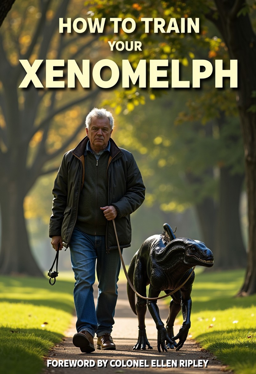 (masterpiece, best quality, ultra detailed, sharp focus, highres, elaborate atmosphere:0.90, 8K,UHD resolution, Ultra Detailed 8K CG, ultra high res, High quality texture, High quality shadows, vivid colors, book_cover, title says "How to train your Xenomorph", the title "How to train your Xenomorph" is written on bold font,The cover features a middle-aged man walking a xenomorph on a leash, outdors, day, park, At the bottom of the cover appears the text "Foreword by Colonel Ellen Ripley"